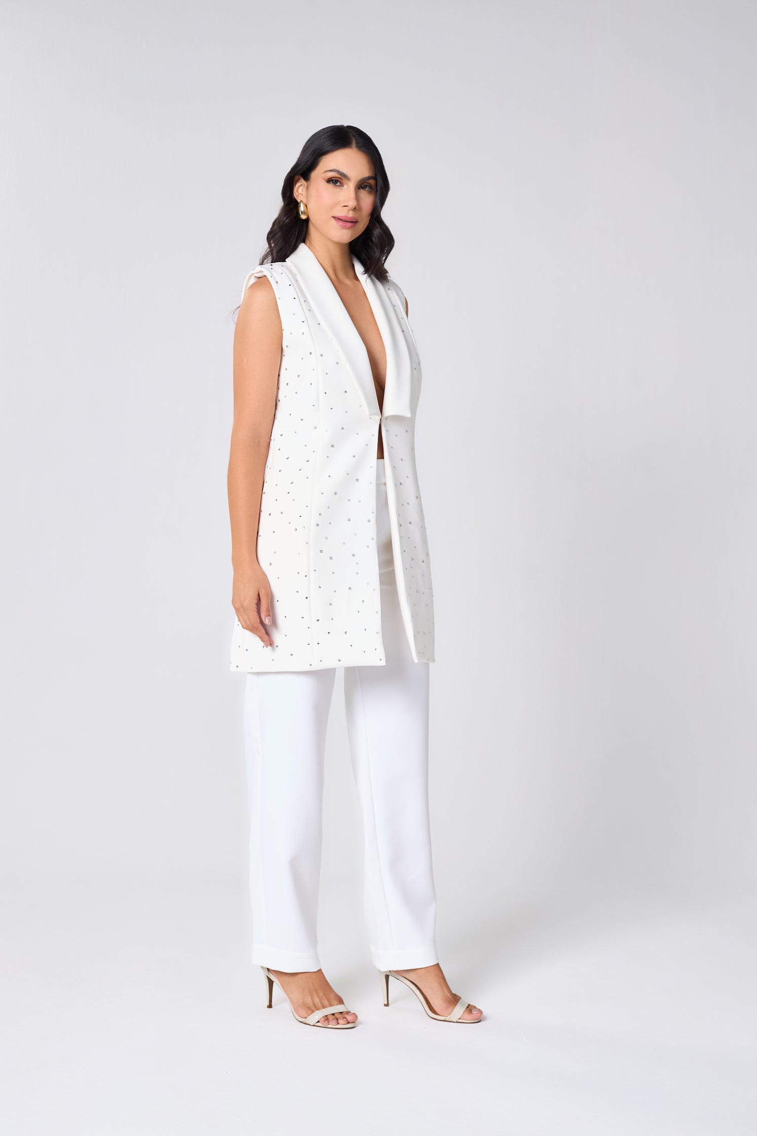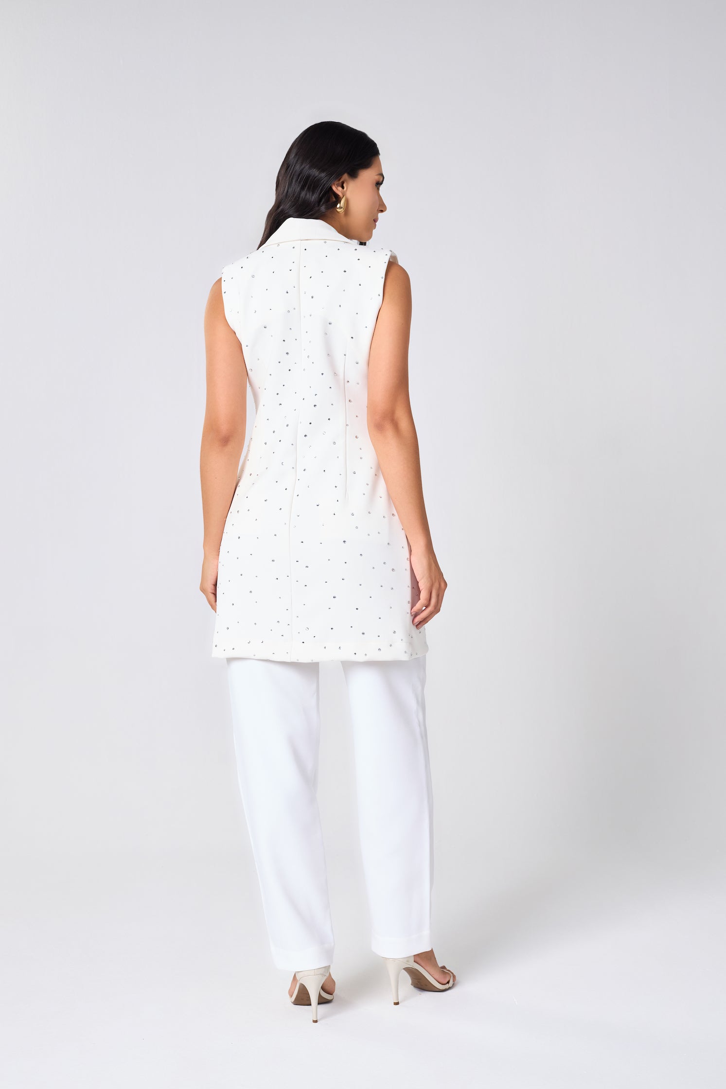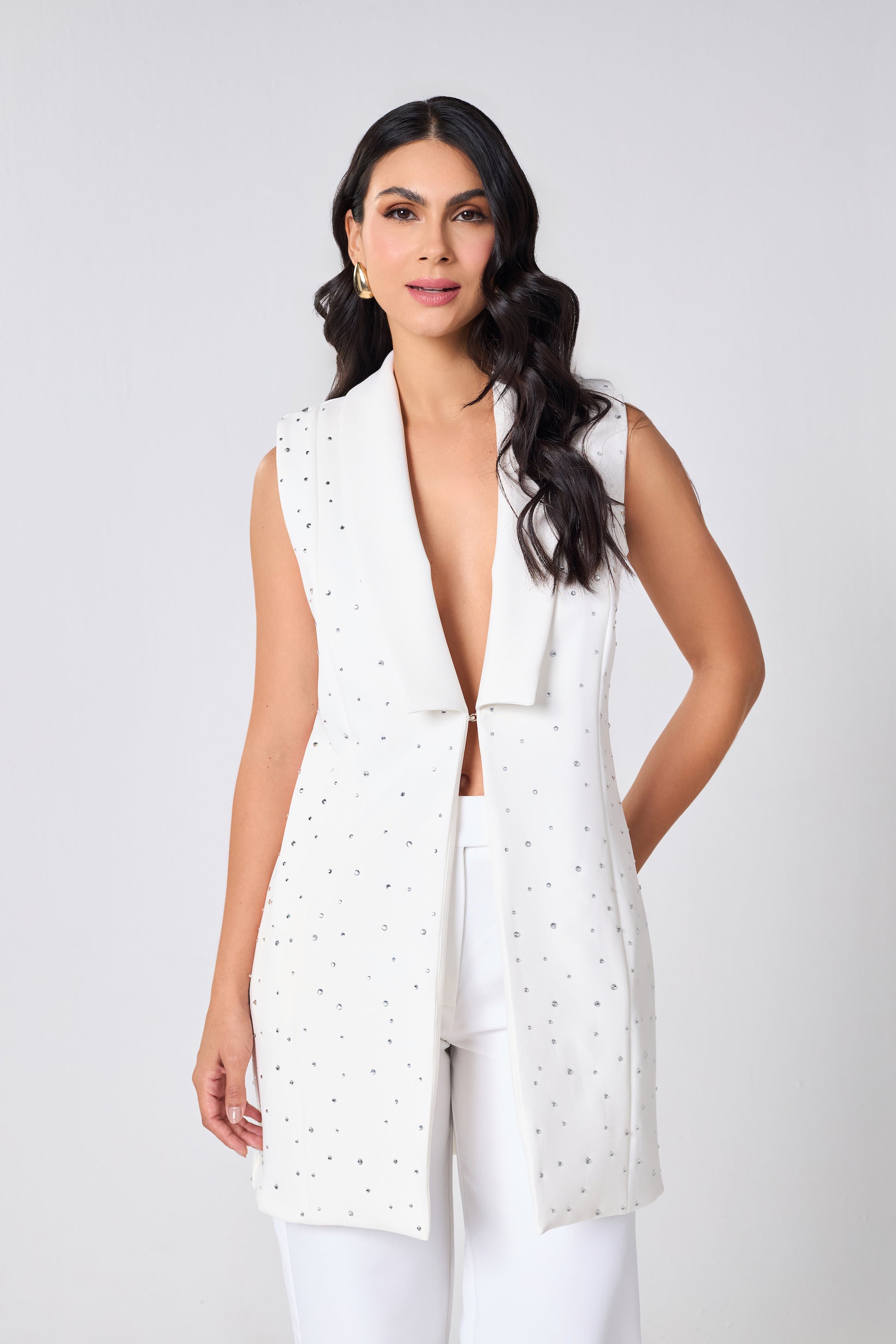 O Colete Cristal é uma peça desejo da Seiva.. Sua modelagem alongada em alfaiataria confere imponência e fluidez ao visual, enquanto as aplicações manuais de cristais garantem um brilho sutil e luxuoso, na medida exata entre poder e delicadeza.
