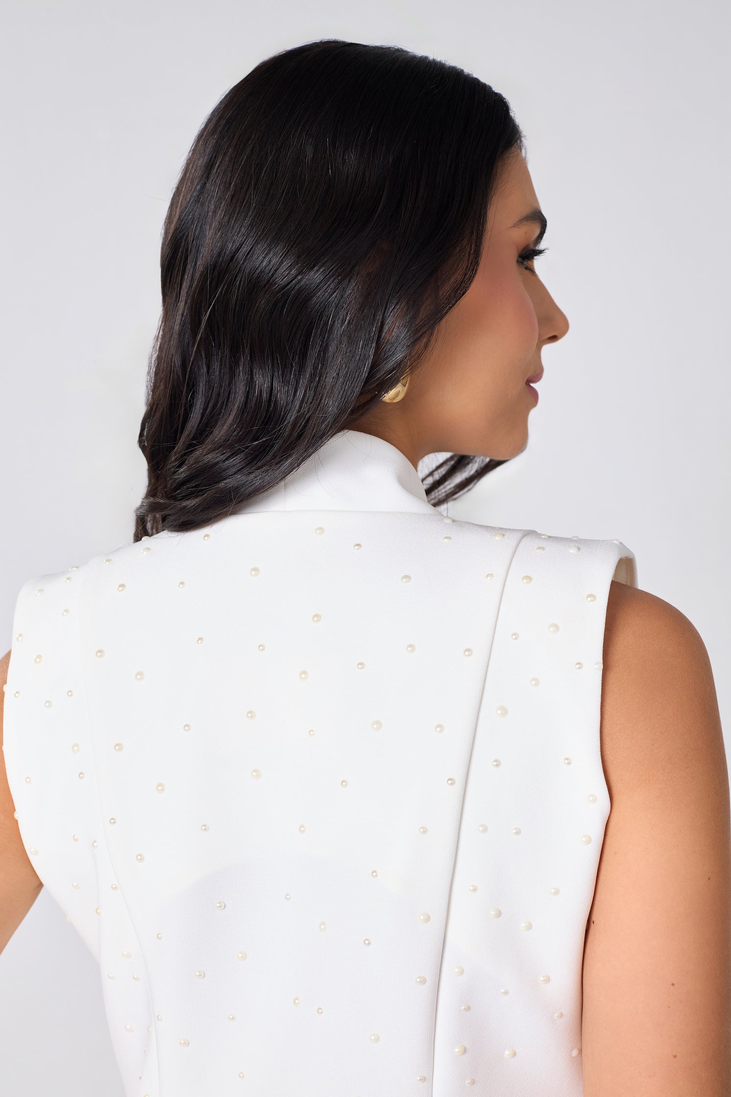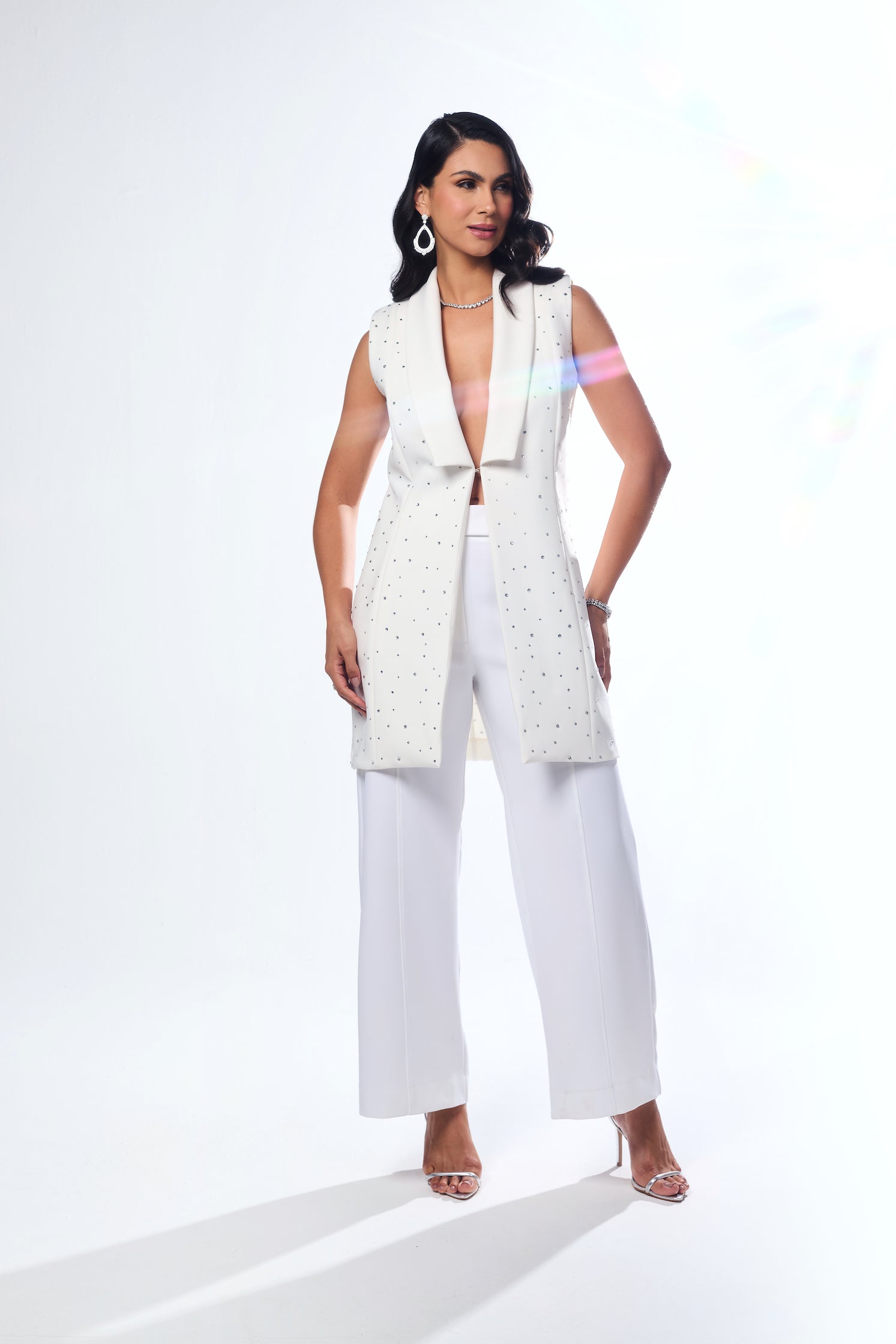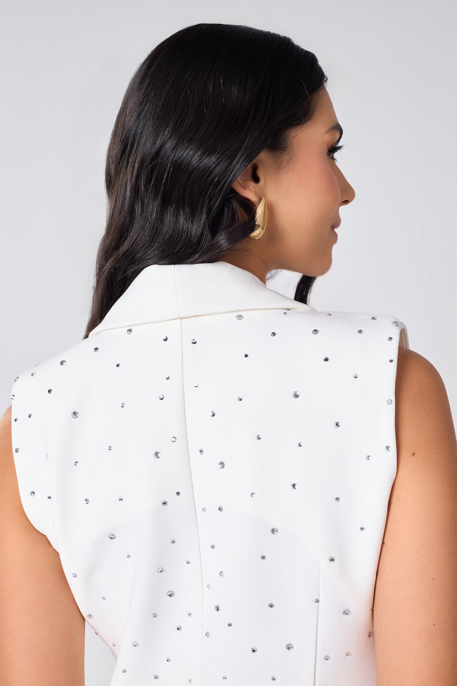 O Colete Cristal é uma peça desejo da Seiva.. Sua modelagem alongada em alfaiataria confere imponência e fluidez ao visual, enquanto as aplicações manuais de cristais garantem um brilho sutil e luxuoso, na medida exata entre poder e delicadeza.
