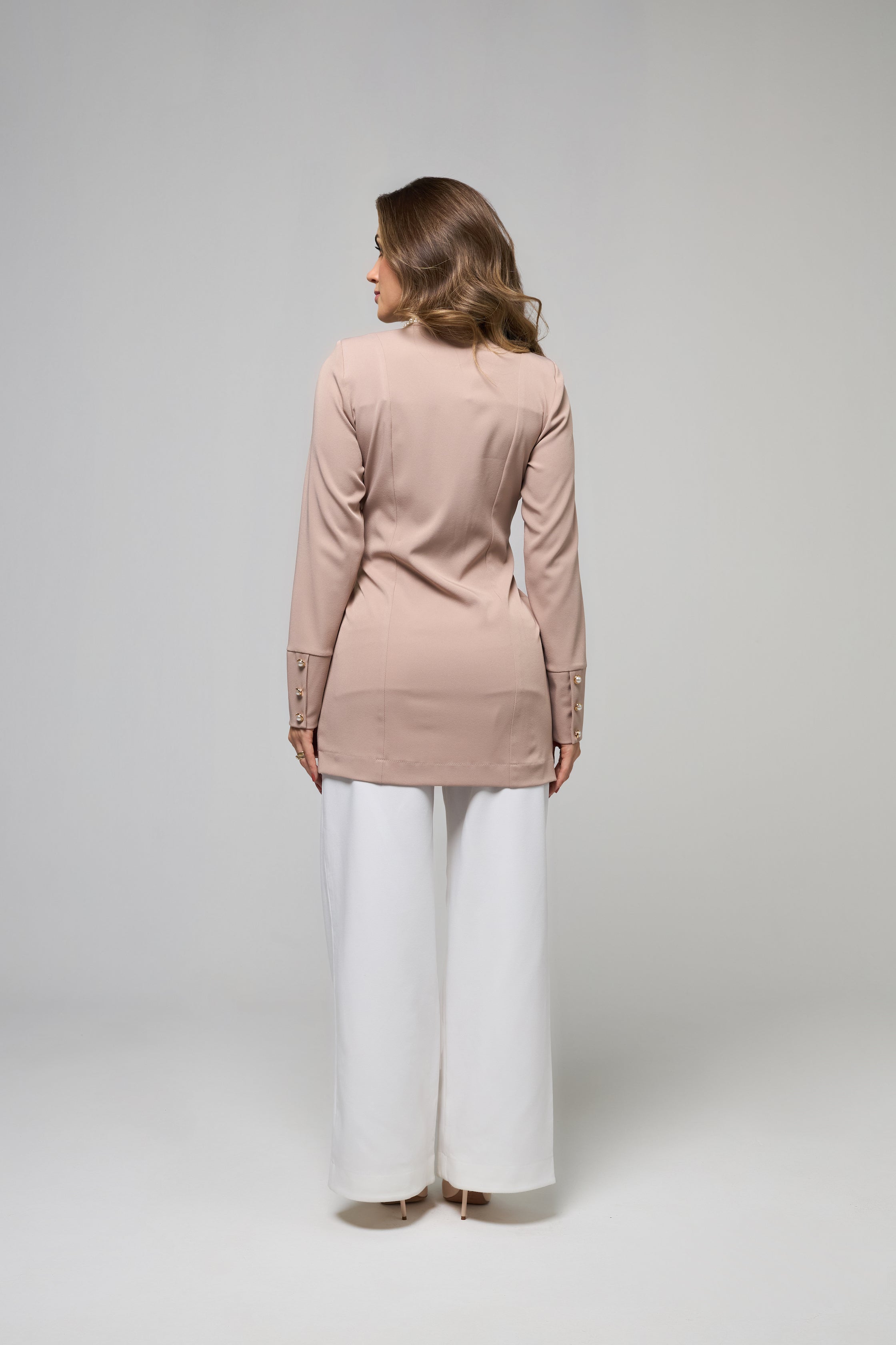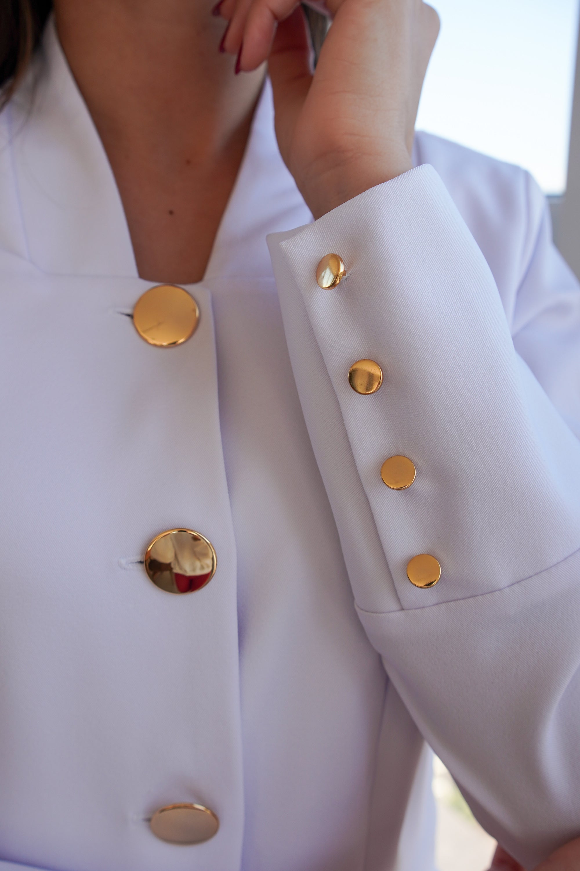 Ambos os jalecos possuem botões banhados, corte de alfaiataria impecável e tecido tecnológico que estica e não amassa, perfeitos para um dia inteiro de trabalho com sofisticação.