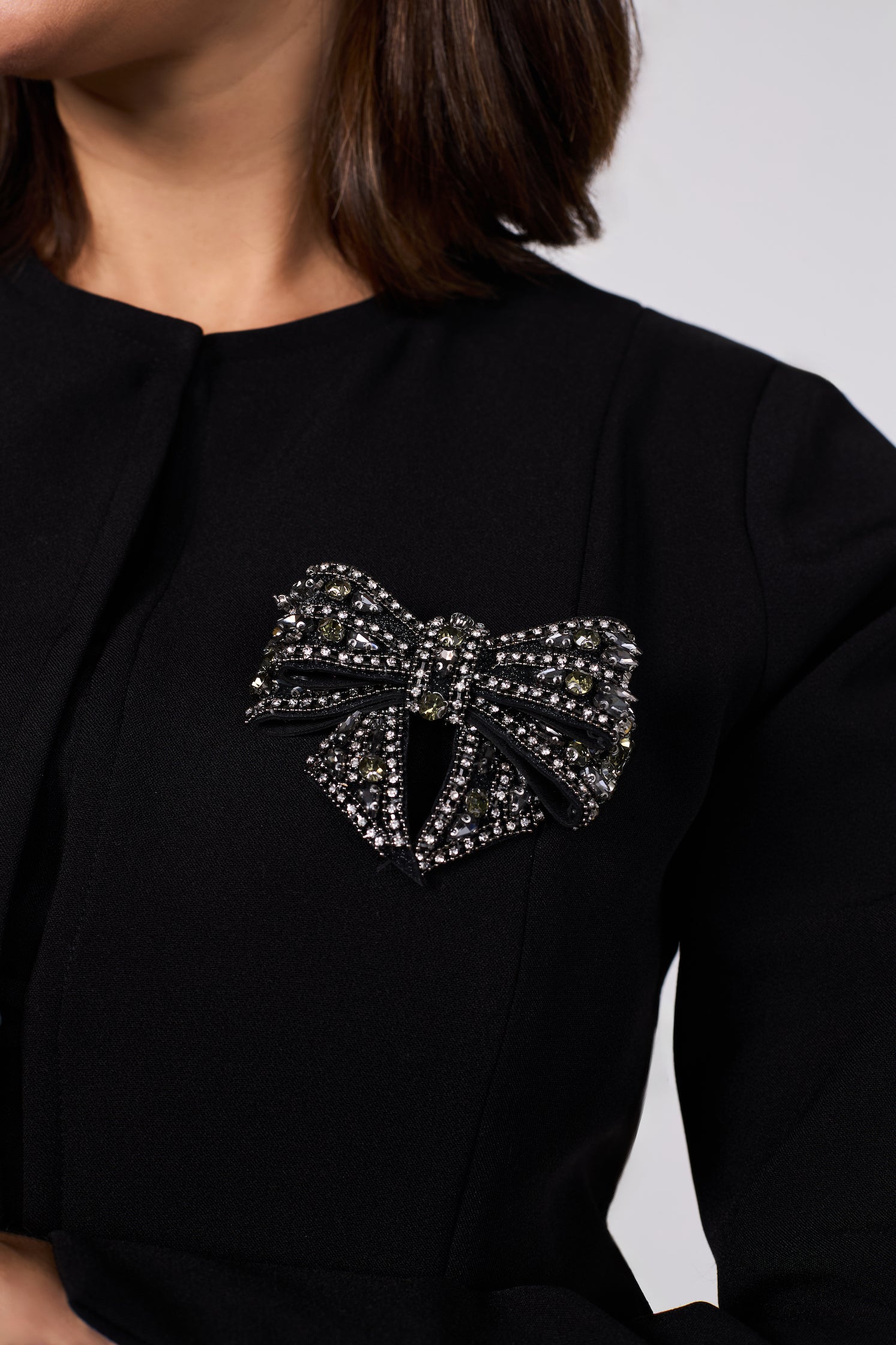 Possui fechamento interno com botões forrados e acompanha um broche de laço inteiramente bordado, que pode ser removido para variar o visual.