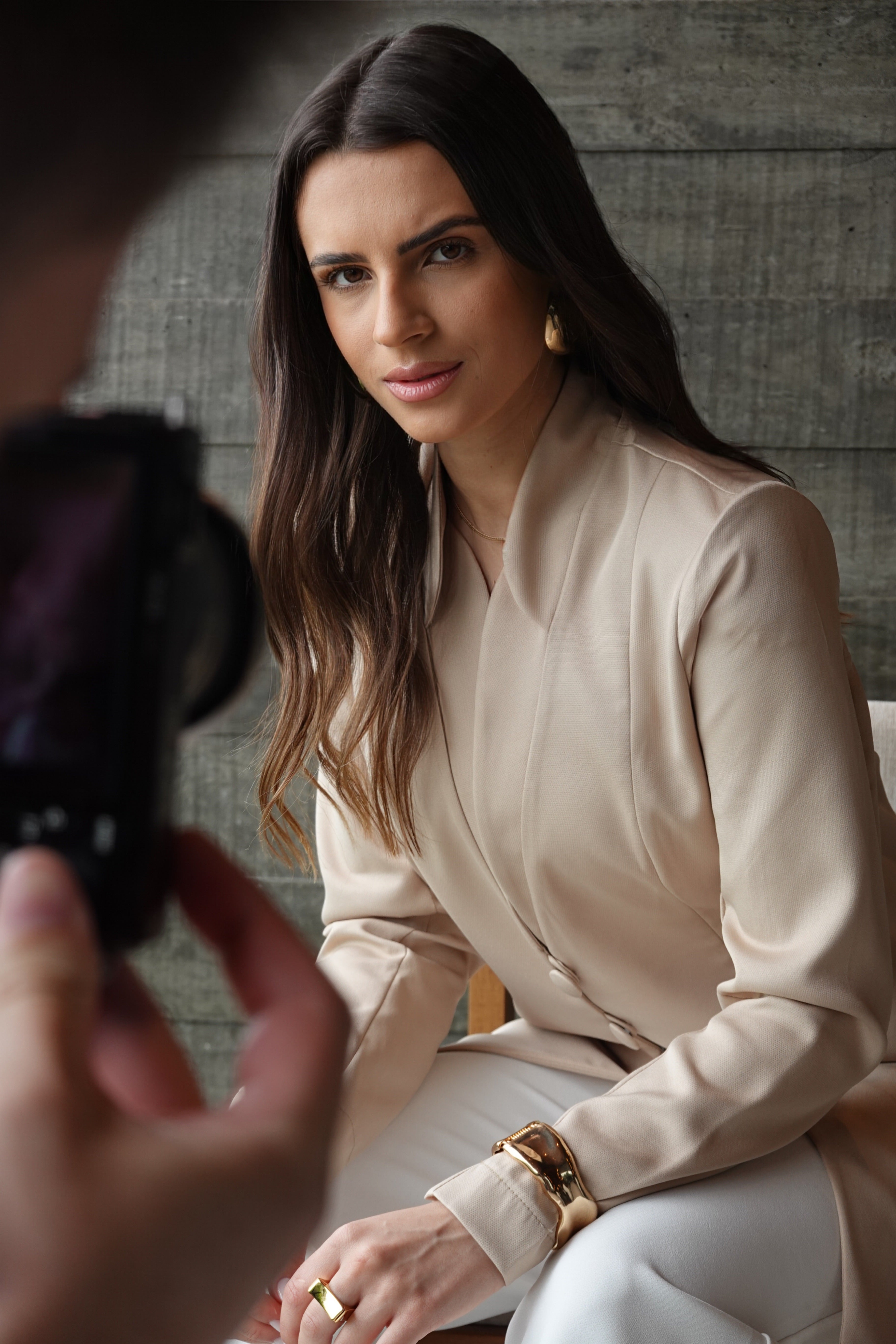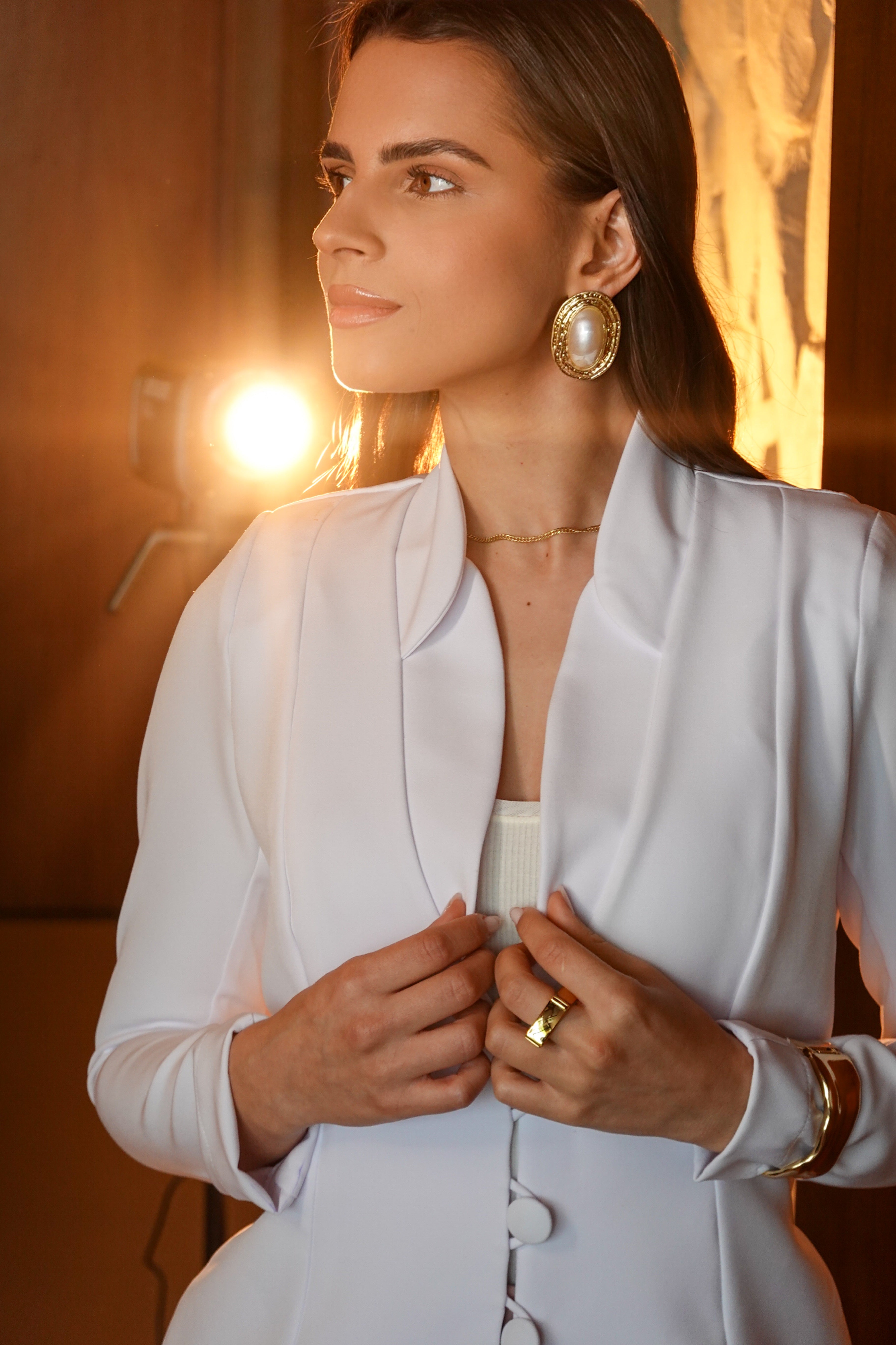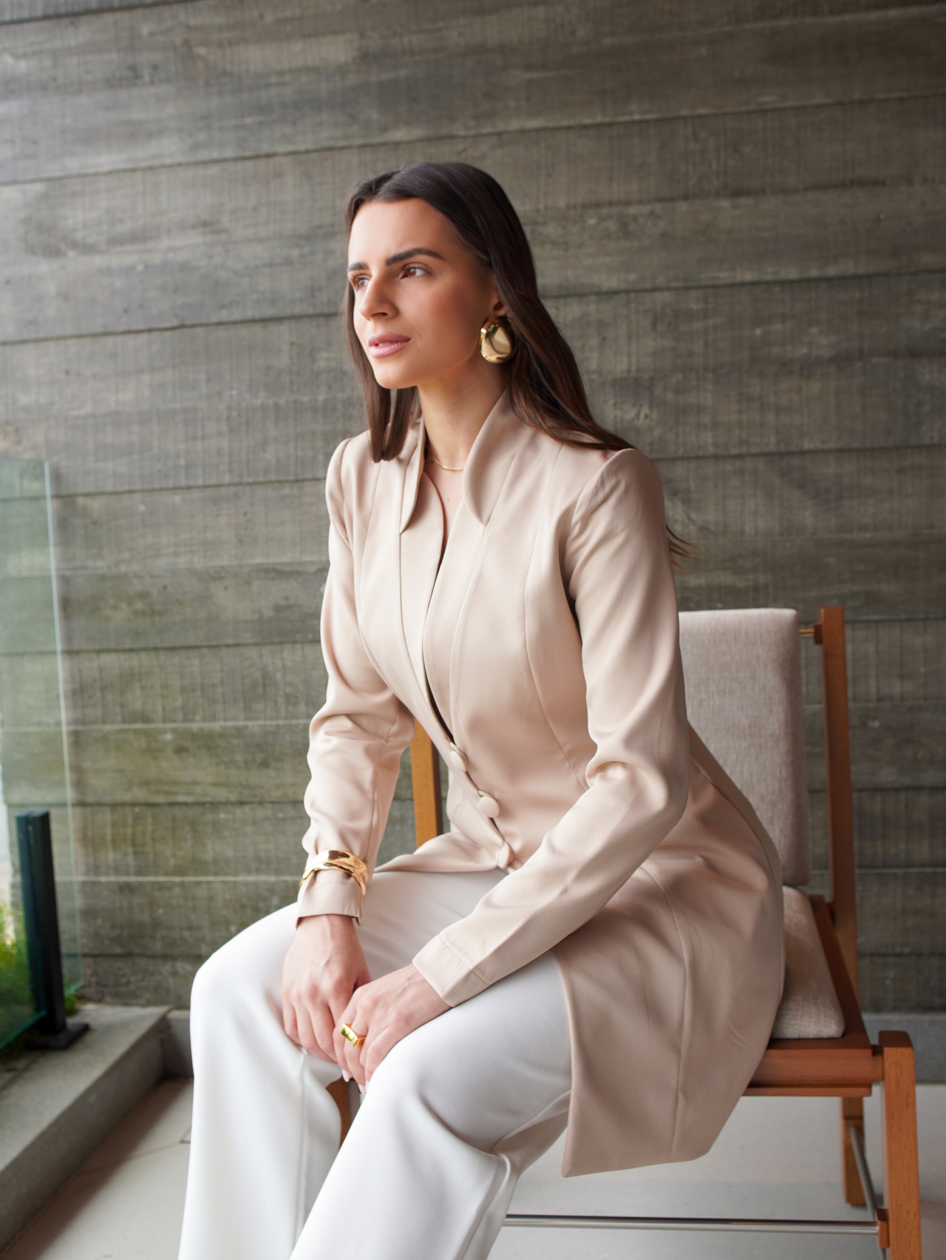 Modelo feito em alfaiataria, com três botões forrados, tecido que estica e não amassa, com ombreiras e feito em ateliê.